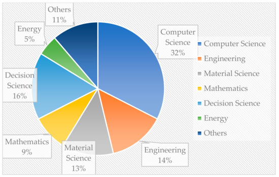 Figure 5 depicts the distribution of the selected studies in terms of subject areas. The highest percentage of studies was found in the field of computer science (32%), followed by decision science (16%), which was followed by engineering (14%), material science (13%), others (11%), mathematics (9%) and energy (5%). This indicates that in comparison with other fields of study, computer science has performed more investigation of the use of AI methods for IoT cybersecurity threats.