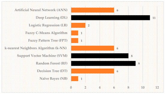 Figure 6 illustrates the characteristics of the selected studies that examined the implementation of different AI algorithms in detecting threats to the IoT. These algorithms are naïve Bayes (NB), decision tree (DT), random forest (RF), support vector machine (SVM), support vector regression (SVR), k-nearest neighbors algorithm (k-NN), fuzzy pattern tree (FPT), fuzzy C-means algorithm, logistic regression (LR), deep learning (DL), and artificial neural network (ANN). The results indicate that 15 studies used DL algorithms, 34 studies used various ML algorithms, and other studies focused on the current issues related to IoT security.