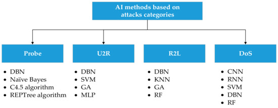 In this section, we provide an AI roadmap with brief overview of its development in detecting cybersecurity attacks within IoT systems. The methods have been categorized based on the cybersecurity threats they identify such as Probe, U2R, R2L and DoS as shown in Figure 8.
