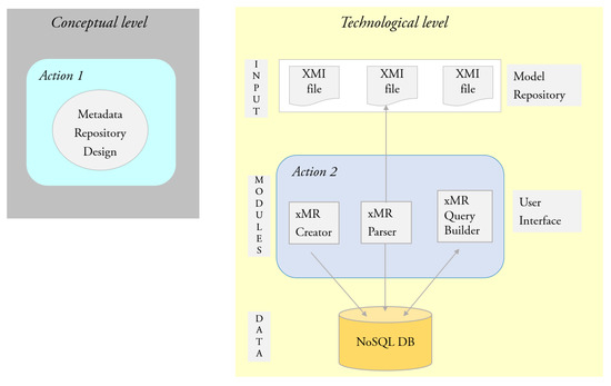In [11], the authors provide an overview of the objectives, beneficiaries, architecture and technologies of an ongoing industrial project whose goal is to release an open-source software tool (called xMetaRep) devoted to the creation, feeding and querying of a metadata repository about UML class diagrams. The project comprises two distinct actions: the first belongs to the conceptual level, while the second one belongs to the technological level (Figure 1). Action 1 involves the design of the metadata repository about class diagrams, while Action 2 concerns the development of the user interface (i.e., xMetaRep) on top of it.