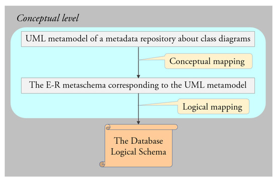The design of the metadata repository starts from a general UML metamodel of the repository. The latter is then mapped into the corresponding Entity–Relationship (E–R) conceptual metaschema (Figure 2). The translation of such a schema produces the logical schema of a relational database.