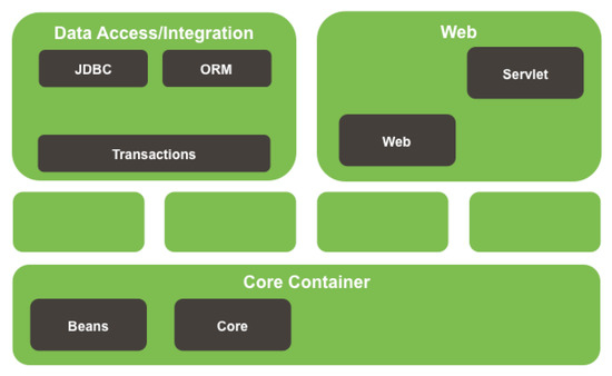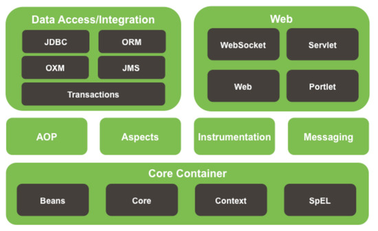 The parser has been implemented as a Java web application that adheres to the Model-View-Controller (MVC) pattern. The Spring framework (https://docs.spring.io/spring-framework/docs/4.3.x/spring-framework-reference/html/overview.html, accessed on 14 September 2021) was used for creating the application. Spring is the most adopted Java framework worldwide. Figure 7 shows the full stack of the Spring framework, while Figure 8 shows only the modules that were used in the development of the parser.