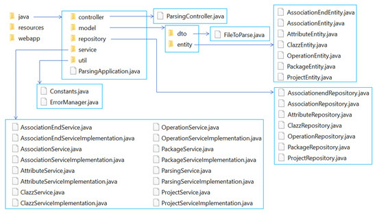 The code of the parser inside the main folder is structured as shown in Figure 9. The class ParsingApplication.java (annotated as @SpringBootApplication) is the entry point of the Spring Boot application. Overall, the web application consists of 20 classes, 15 interfaces and 2 views, as described below: