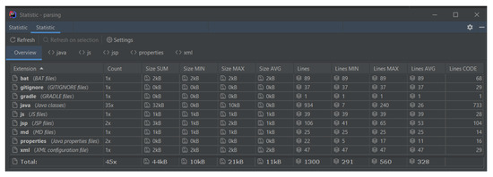 The screenshot in Figure 11 collects the statistics of the parser web application. Files bat, gitignore, gradle, md and properties are auto-generated by the Intellij Idea IDE when the software project is created; the remaining files (java, js, jsp and xml) were written by us. The second column of the figure counts the number of files of a given category in the web application. For instance, we can see that there are 35 Java classes (Figure 9 confirms such a number). The total number of lines of CODE is 894 (blank lines excluded), while 128 is the total number of autogenerated LOC.