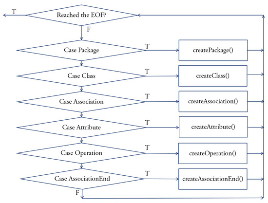 The algorithm behind the parser works as follows. Preliminarily, checks are carried out on the existence of the file chosen by the modeler, in order to ensure that it has an XMI extension and that it is not empty. If the checks are successful, then the actual processing begins. The first step reads the input XML file and creates a tree-like structure, which resides in the main memory. This step is accomplished by the Java DOM parser. The visit of the tree data structure is organized as a cycle in which, at each iteration process, one of its “nodes” is searching for one of the six XMI types that we are interested in, namely (Figure 13): uml:Package, uml:Class, uml:Association, uml:Attribute, uml:Operation, and uml:AssociationEnd. At the end of the iteration, it is the responsibility of the saveToDb() method and the Hibernate ORM to perform the uploading of the metadata collected in the output list into the repository.
