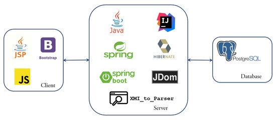 The extraction of the metadata from the XMI file (i.e., class names, attributes, operations, association ends, multiplicities, association names, etc.) is done by xMR Parser, while their persistence is the responsibility of the Repository layer (Data Access) (Figure 12). xMR Parser is a component of the xGenerator proprietary software [16]; it has been wrapped inside the Service layer (which implements the Business Logic of the Web application) (Figure 12). xMR Parser is an alternative to the well-known Acceleo (https://www.eclipse.org/acceleo/, accessed on 14 September 2021), an open-source solution. In our case, the adoption of Acceleo would have required much more time than xMR Parser, which, on the other hand, we were familiar with.