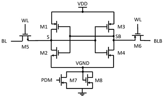 The 6T-SRAM cell considered in this paper is depicted in Figure 1. It is made up of two inverters (composed of transistors M1–M2 and M3–M4, respectively) and two pass-transistors, M5 and M6, that enable the functionalities of the cell. When writing/reading operations are performed, the WL signal is high, allowing the BL and BLB signals to be connected through M5 and M6 to the S and SB nodes, respectively.