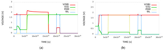 Figure 5a shows the results of the simulation of an LPR test in the RX’ ÷ RX’’ range, which detects a bit-flip after switching the mode of the cell and reading the data stored with R1 injected in the cell. For the sake of comparison, Figure 5b depicts the behavior of an LPR test of a fault-free SRAM cell. Looking at the figure, we can see that after exiting LPM, the SB voltage node sharply decreases causing a failure in the cell behavior and allowing defect detection when the reading action is performed in the cell. The LPM is usually in the millisecond range at least, but it has been shortened for clarity.