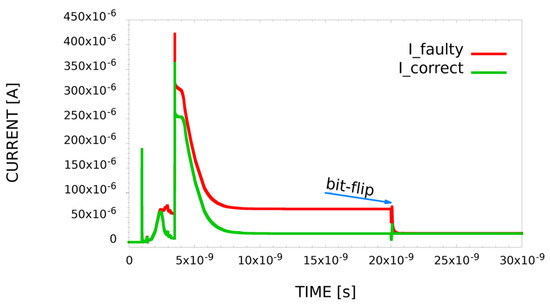 Looking at Figure 7, we can see the trend of the current during the LPR test simulation with a decreasing R1 defect inserted in the cell. In particular, the green line depicts the current consumption of an LPR test with a fault-free cell. We can see that the quiescent current maintains its low value during the operation inside the cell. The red line depicts the current consumption of an LPR test in the sub-range of RX’ ÷ RX’’. In this case, we can see that the quiescent current is higher than the previous one, that is up to 20% more than the previous one. As the arrow indicates on the figure, the more R1 is increased, the lower the effect on the power consumption we have inside the cell until we have no impact when the R1 value is below RX’ (as the arrow indicates in the figure when we have the bit-flip).
