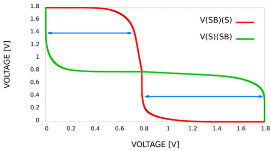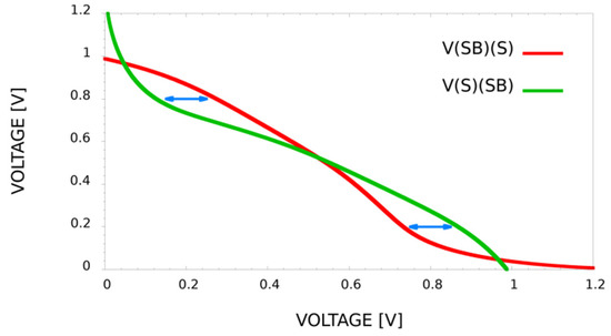 The static noise margin [17,18,19,20] measures the stability of the cell and it is defined as the minimum noise voltage present at each of the cell storage nodes (S and SB) necessary to flip the state of the cell. It could be split in three types: Hold noise margin, write noise margin, and read noise margin. For this study, we considered only the hold noise margin, in order to check the reliability of the cell. We analyzed and measured it during each steady-state data simulation. We will consider the impact on SNM not only when the cell does not work because of the defects, but also when the defective cell is working, as well. Indeed, when a defective cell continues working despite the presence of the defect, further analysis could be necessary to better understand if the reliability of the system could be compromised. In Figure 2, we report the typical and symmetrical behavior of the SNM for a fault-free cell. The SNM can be obtained by varying the V1 and V2 voltages that represent the S and SB node voltage values, respectively. The two signals are represented at the same step along the two axes, until the two curves are adjacent. The following flow is implemented to achieve a butterfly-line graph, which is representative of the status of the static noise in the circuit: