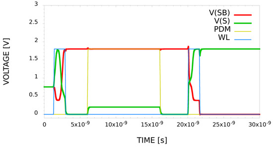 To implement our analysis, we properly drive the WL signal to write the cell, the PDM signal in order to enable/disable the LPM in the cell, the PCON signal to enable/disable the pre-charge circuit, the BLCON signal to enable/disable the bit-lines, and thus the column of the cells (we consider them with high-impedance end).