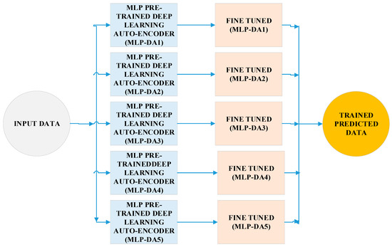 Additionally, two auto-encoders and the Softmax activation function are used in the MLP deep auto-encoder. The auto-encoders learn high-dimensional data from the input vectors while also reducing the number of attributes. In contrast, rapidly decreasing the variety of features in one auto-encoder might result in critical features being missed and accuracy being negatively impacted. A typical MLP auto-encoder classifier discriminates against the hidden layer on multiple levels, including nonlinear stimulation, to differentiate nonlinear differentiated data [43]. Firstly, the encoding strategy can use the encoding function to encode the assigned input, as shown in Equation (1).