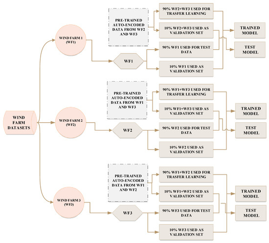 In the first phase, the training of Windfarm 1 (WF1) was performed using data from the second and third windfarms. In the second phase, the training of Windfarm 2 (WF2) was performed using data from the first and third windfarms. In the third phase, the training of Windfarm 3 (WF3) was performed using data from windfarms 1 and 2. Throughout the first phase, 90% of the data (WF2 + WF3) was reserved for transfer learning, where 90% of WF1 data was used for testing purposes. The remaining 10% of WF2 + WF3 and WF1 data were used for validation purposes. During the second phase, 90% of data (WF1 + WF3) was reserved for transfer learning, while 90% of WF2 data was used for testing purposes. The remaining 10% of WF1 + WF3 and WF2 was used for validation purposes. During the third phase, 90% of data (WF1 + WF2) was reserved for transfer learning, while 90% of WF3 data was used for testing purposes. The remaining 10% of WF1 + WF2 and WF3 was used for validation purposes. Lastly, all data (WF1, WF2, WF3) from the three windfarms were used to train the model regarding selected parameters during the validation phase.