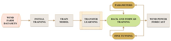 The pretrained models were further utilized for transfer learning on all three windfarms. Lastly, the forecasting accuracy for the regional wind farms was measured based on forecasting error indicators such as MAE, RMSE, etc. The overall structure of the proposed wind power forecasting model is shown in Figure 1.