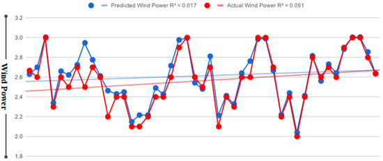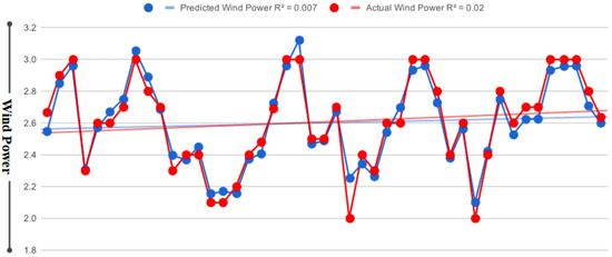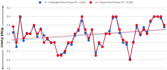 The Keras interface provides an easy way to transform different layers and functions in the TensorFlow platform for the design of forecasting models [51]. The user-defined functionality can perform complex forecasting tasks in short periods of time. The proposed forecasting model was compiled for each windfarm. The actual and predicted wind power outcomes for each dataset are shown in Figure 5, Figure 6 and Figure 7, respectively. Figure 5 shows the proximity between the original and forecasted outcomes and their R-squared correlation for Windfarm 1, Figure 6 shows the actual and forecasted outcomes linked to Windfarm 2, and Figure 7 shows the forecasted outcomes related to Windfarm 3. In each figure, the blue curve indicates the predicted power outcomes, while the red curve shows the original power outcomes generated by the windfarms at different intervals. All figures show that the predicted and actual wind power is closely related, with only minor variations. The forecasting assessment therefore revealed that the proposed forecasting model is very effective for forecasting wind energy, while transfer learning is more suitable for improving forecasting outcomes with less training on large and complex regional windfarms.