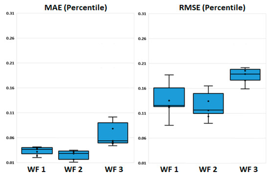 Distribution of MAE and RMSE Errors (Percentiles) for Windfarms “WF 1”, “WF 2” and “WF 3”.