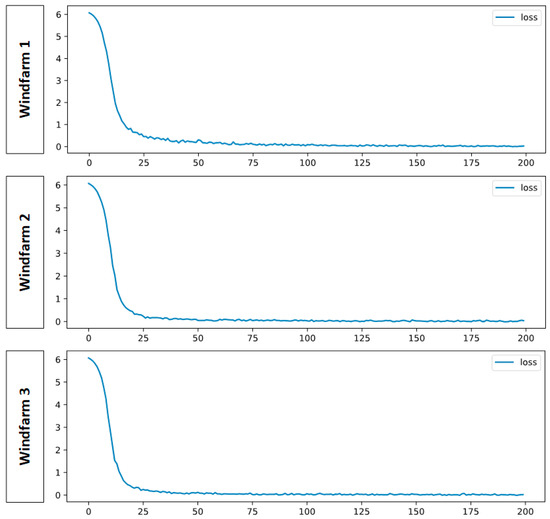 Deep learning models often under- or over- fit, depending on the data and fine-tuned parameters. Thus, retraining errors were visualized via epochs to measure the stability and feasibility of the deep learning model for wind power data and the fine-tuned parameters. In this study, the proposed deep learning model was executed against 200 epochs on three windfarm datasets to validate its stability and measure retraining losses. Figure 9 shows the retraining loss produced by proposed model, where the x-axis represents loss against the next epoch cycle and the y-axis represents the accuracy loss for each windfarm.