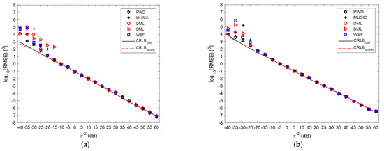 The RMSE of an individual technique over 100 Monte Carlo samples for different noise variances is shown in Figure 3. Moreover, Figure 3 shows the theoretical CRLB performance for the deterministic and stochastic cases. For one signal scenario, it can be observed that both techniques have almost the same performance. The RMSE of the techniques adheres to the CRLB when The elevation angle estimation has a smaller RMSE, just as in the CRLB prediction.