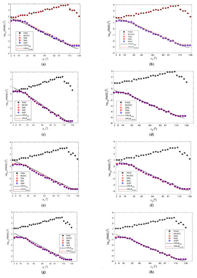 (a–h) RMSE over CRLB and 100 Monte Carlo samples when SNR = 20 dB for chosen frequencies: (a) (b) (c) (d) (e) (f) (g) (h). (i–p) RMSE over CRLB and 100 Monte Carlo samples when SNR = 20 dB for chosen frequencies: (i) (j) (k) (l) (m) (n) (o) (p).