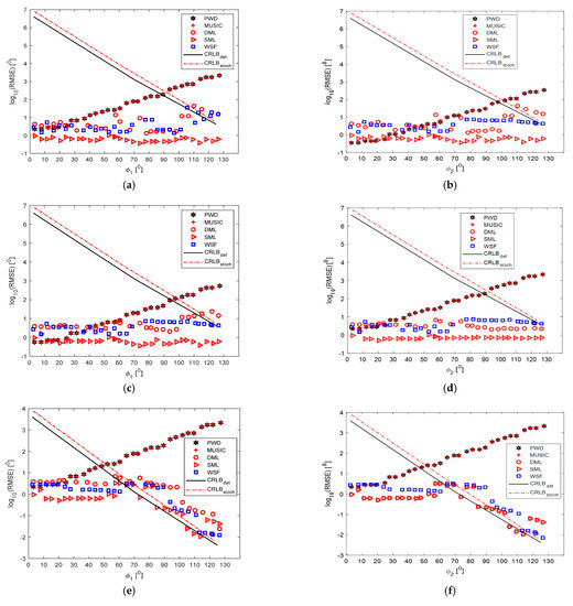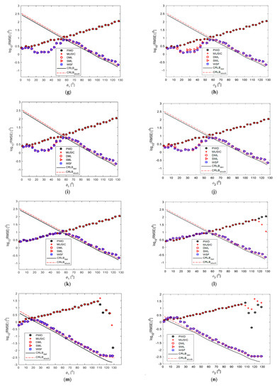 Low variance is assumed by CRLB [26]. Based on [31], RMSE and CRLB agree by approximation when the DoA theoretical standard deviation of the signals is less than the half-angle of separation. This also holds for the cases studied. When and , the CRLB is for the first signal and for the second signal, which is higher than half of the separation angle .