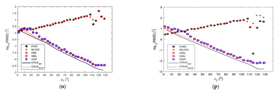 The RMSEs for CRLB and all of the techniques over 100 Monte Carlo samples against when and the second signal is delayed by d samples are shown in Figure 4. Firstly, it can be observed that PWD performs poorly in the estimation of DoA of multiple signals because its increases as its RMSE increases. This can be interpreted as a bias in estimation: the PWD global maximum is found in between the true values, and the second maximum is apart from the second one; the two signals generate a maximum in the spatial spectrum of PWD in between the true values of and . Due to the large energy that this maximum has, RMSE is lower than CRLB, with . In addition, the next PWD spectrum maximum is generated by the steering vector’s conjugate value that generated that global maximum. MUSIC has an identical profile to PWD, and its estimation is identically biased when . Similarly, MUSIC and PWD performance improves slightly when . Consequently, the segregation is longer than the Rayleigh resolution , and the techniques segregate the two signals. Nonetheless, estimates of PWD and MUSIC are also biased when