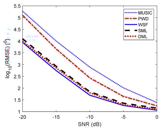 Figure 6 shows the simulation result for RMSE against SNR for MUSIC, PWD, DML, SML, and WSF. WSF shows better performance in the low-SNR regime. DML and SML show a high level of similarity to WSF. DML and WSF show greater performance than SML. This is because SML converges to a local minimum but does not exhibit convergence to the global minimum. MUSIC and PWD exhibit worse performance compared to other techniques, as in other cases. WSF and DML exhibit identical behavior. Hence, they are good choices in multiple signal analysis, especially in the single-frequency analysis. Furthermore, WSF is more computationally efficient for large U than DML. In the wideband scenario, there will be no wide gap in the performance of any of the techniques.