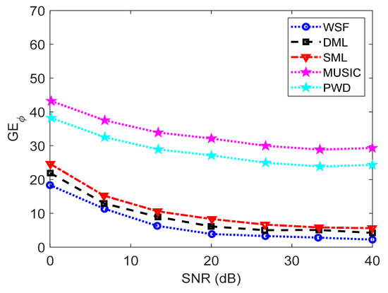 GE performance evaluation of MUSIC, PWD, DML, SML, and WSF against SNR using the measured data in [40].