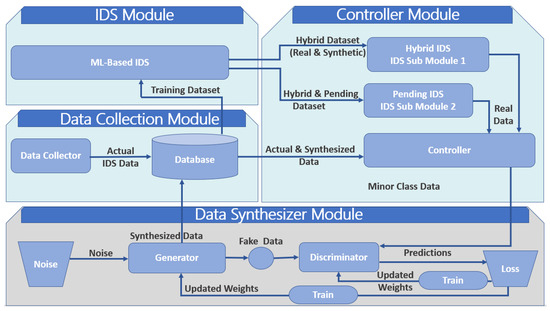 In addition to the generated synthetic data by the synthesizer module generator, the database module contained real-world intrusion detection data. The controller module decided whether to accept or reject pending data, i.e., synthetic data was data that had not been accepted or rejected by the controller. The GAN, which is part of the synthesizer module, generated the synthetic data. The synthesizer labeled the generated data as pending, due to the uncertainty of the GAN, before sending it to the database module. The authors used the controller module to evaluate the IDS module twice. First, they trained the IDS module on a hybrid dataset only, i.e., the combined original and synthetic data already accepted by the controller. Then, they trained the IDS module using a combination of the hybrid and pending datasets. The controller accepted or rejected the pending data based on the IDS performance. By measuring the detection rate for each data class (normal or attack) and comparing it to a pre-established performance threshold, the controller identified the weakly detected classes and sent the data examples to the synthesizer module to generate more examples. The process repeated until a satisfactory IDS performance was obtainable. Figure 1 shows the G-IDS framework, where and denoted IDS performance using hybrid and pending data, respectively. Comparing the performance of the G-IDS to a standalone IDS (S-IDS) or an IDS without a GAN using precision, recall, and F1 score as metrics, G-IDS performed better than S-IDS in terms of detection accuracy and stability on both the original and boosted datasets. The f-score of S-IDS was 70% to 78% using a 20% and 40% data increase, respectively, compared to G-IDS, which was 90% to 96% for a 20% and 40% data increase, respectively. However, G-IDS f-score dropped significantly to 60% for a 60% data decrease due to the G-IDS taking random noise as input. In terms of prediction accuracy, S-IDS performance suffered due to insufficient data. G-IDS generally had better performance and prediction accuracy; however, it is centralized and computationally expensive.