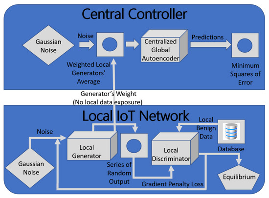 Training an anomaly-based intrusion detection system to detect intrusions in IoT environments is challenging due to the lack of sufficiently-large benign IoT data and the inability to collect IoT data from IoT devices directly due to high scalability and privacy restrictions. In addition, device disparity and activity scarcity make it harder to acquire reliable benign IoT data. The authors in [29] addressed these issues by proposing a data aggregation and privacy preservation hierarchical approach in which a GAN and an AE cooperated to reconstruct IoT benign data for training a global anomaly-detection IDS and set of local anomaly-detection IDS implemented at the local gateways. The hierarchical method used local GANs implemented at the local IoT networks to generate benign data and a global GAN to reproduce the aggregated benign data, which is double the size of the real data in the local IoT networks. Each local IoT network consisting of a set of local IoT devices and their generated data are aggregated at the global level using a centralized controller. The data generation occurred at the local GANs. First, the generator, which consisted of sequential layers, took a Gaussian Noise with random dimension size as input and generated a series of random outputs. Next, the discriminator combined the generated sample with the benign local data. Then, the generator and discriminator, which had symmetrical structures, were trained simultaneously. Finally, the data from the local generators were aggregated at the centralized AE to reproduce new benign data to train the global AE model that was double the size of the local networks’ training data. Figure 2 shows the training map of the proposed hierarchical approach. The authors evaluated the proposed model GAN plus Autoencoder (GAN-AE) using the UNSW BoT-IoT dataset and two cases; the global model with all data and the local model with local data only. The GAN-AE model, global model, and local model outperformed four popular binary clustering approaches: one-class support vector machine (OSVM), isolation forest (IO), local outlier factor (LOF), and K-Means clustering. In particular, the GAN-AE, global model, and local model accuracy, precision, and recall were higher than 90%, with the global model outperforming the local model. However, the local model overfitting towards the local data was a drawback to the proposed approach, resulting in poor prediction accuracy of anomalies.