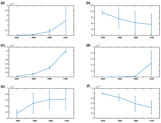 Experimentally observed dimerization curve of -C monomers are fitted to a monomer-dimer two-state interconversion model (SI S2. Equations (7)–(9) [41,42]) producing the overall association rate constant and the overall dissociation rate constant . In the model used by AKPE, the existence of the intermediate state introduced rate constants , , and . Bridging rate constant and the kinetic rate constants in AKPE, we arrive at the conversion formula Equation (22). The second term in the expression of should be around zero, therefore, the kinetic parameter generated by AKPE should equal to the according to Equation (22), calculated from AKPE in different temperatures and for different mutants are listed in Table 5, it agrees very well with the experimentally fitted association rate constant , common metrics measuring the agreement between these two methods such as MAE and RMSE were also given in the table, less than 5% of MAE and RMSE are observed between the predicted values and the experimental data, confirming the accuracy of AKPE at predicting kinetic rate constants Figure 9.