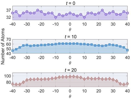 Simulation of solidification in the TSV requires solving six equations related to and in Equation (5). Nuclei with a triangular lattice are placed inside the TSV and initialized according to Equation (7). The atom density fields of the initial circular grains, with radii setting to the same value of 15, can be obtained by the relationship between the atom density field and the complex amplitudes and according to Equation (1). The snapshots of the microstructures in the TSV at 0, 50, and 180 during solidification are shown in Figure 3. At the beginning, the TSV contains only six nuclei with different orientations, and the remaining area is filled with supercooled liquid, as shown in Figure 3a. As solidification proceeds, the liquid in the TSV is gradually consumed, and finally, the inner cavities are filled with crystalline solids when all the liquid is consumed up. To obtain an explicit picture on the grain structure, the defects atoms, which are identified as the atoms missing one or more of the first nearest neighboring atoms, are outlined by red closed curves, as shown in Figure 3d. Figure 4 shows the number of atoms in the growing nuclei with different orientation at 0, 10, and 20 during solidification. Comparing the growth rates of those grains with ranging from −40 to 40, it is found that the growth rates are not constants but symmetric about the line . Furthermore, the growth of the nuclei also depends on the parameter in the APFC model, which relates to the degree of undercooling. If is smaller than 1.2, the nuclei inside the TSV will not grow but be absorbed back into the surrounding liquid and vanish.