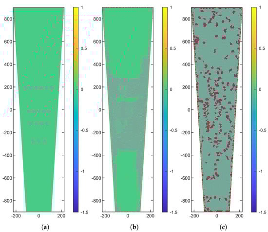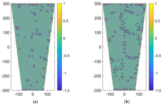 After solidification completes, a stress field induced by the defects inside the TSV can be calculated according to Equation (8). Figure 7b plots present in the microstructure shown in Figure 7a. It can be clearly observed that the stress concentration occurs near defect atoms as well as at the walls of the TSV. Noted that the magnitude of is around 0.25 and substantially smaller compared with caused by external loadings, as discussed in the following sections.
