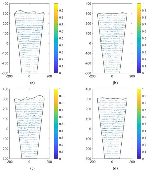 The protrusion profile along with the displacement field for Model 2 subjected to external loadings with different values of p. (a) ; (b) ; (c) ; and (d) .