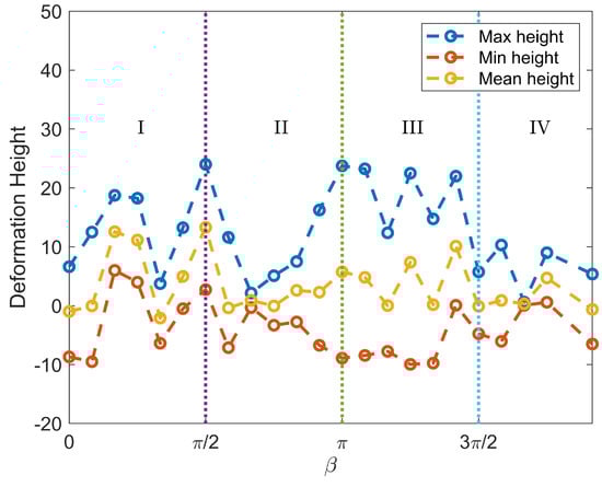 The protrusion profiles of TSVs are governed by the atomic-scale microstructure as well as the stress states caused by external loadings. Therefore, in this section, the effects of stress states on TSV protrusion are investigated. Selected protrusion profiles together with displacement fields for the TSV with microstructure shown in Figure 5b under external loadings with the same magnitude but along different directions with systematically varying from 0 to 23/12 with an interval of /12 are shown in Figure 11. The relationship between the protrusion height and the loading direction is plotted in Figure 12, in which four characteristic regions can be clearly observed and referred to as region I, II, III, and IV, respectively. Despite a symmetric nature of the applied loadings, asymmetric displacement and strain fields result because of the presence of a polycrystalline structure in the TSV. Loadings along different directions result in different distributions of strain concentration inside the TSV, which in turn control the movement of the atoms. It is found that the normal strain generated at the top of the TSV is comparable in four regions as shown in Figure 13, and such that the shear strain needs to be carefully examined. In region I, the positive (counterclockwise) and negative (clockwise) shear strains disperse as fine spots due to the underlying atomic-scale structure in the top region of the TSV, and positive and negative shear strains are counter-balanced so that the shear strains exert little influence on the movement of the atoms in this region. Therefore, the net effect of an external loading in region I is only from , which drives the atoms in the top region to move upwards and results in protrusion. In regions II and IV, the positive and negative shear strains are distributed on the right and left parts of the TSV, causing the atoms in the top region to rotate, thus leading to less protrusion. In region III, the pattern of shear strain is different from the other regions. It is also distributed at the top as in region I, but the shear strain is almost counterclockwise, which drives the top of the TSV to also undergo a larger protrusion but with a different protrusion profile compared with region I. In general, a relatively smaller protrusion occurs in regions II and IV, but a larger protrusion occurs in regions I and III. Although a higher protrusion can occur in both regions I and III, different characteristics of the protrusion profiles can be observed, i.e., protrusion covering the entire top end in region I, while both protrusion and intrusion appear in region III.