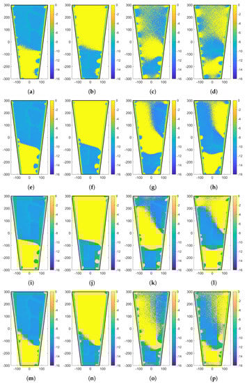 The strain distribution in the TSV with microstructure shown in Figure 5b and varying from to . (a) , ; (b) , ; (c) , ; (d) , ; (e) , ; (f) , ; (g) , ; (h) , ; (i) , ; (j) , ; (k) , ; (l) , ; (m) , ; (n) , ; (o) , ; (p) , .