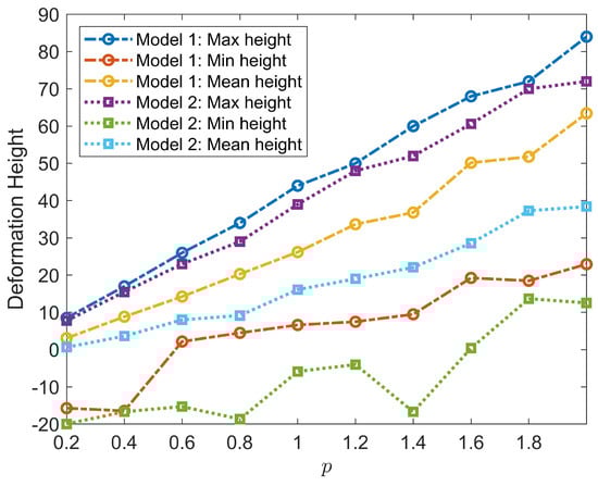 With , referred to as Model 1, and , referred to as Model 2, a systematic change in the magnitude of the external loading applied to the TSV with the microstructure shown in Figure 5b can be studied by conducting a parametric sweep in COMSOL. Thus, a parameter p is introduced and set to change from 0 to 2 with an interval of 0.2, and T can be expressed as . The protrusion height versus p for Models 1 and 2 is plotted in Figure 14, and the protrusion profiles caused by different values of p for model 2 are shown in Figure 15. It can be seen that maximum and minimum protrusion heights increase almost linearly with p, and the slopes of the curves vary in the two models. Moreover, it is found that the protrusion height becomes more and intrusion depth becomes less as the magnitude of the external loading increases but the original deformation trend, i.e., the protrusion and intrusion profile, remains similar. The external loading applied to TSV can be regarded as a driving force for deformation. A greater loading provides a larger driving force and results in more plastic deformation.