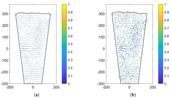 The protrusion profile together with the displacement field in two TSVs shown in (a,b), with the corresponding microstructure shown in Figure 5a,b, respectively, subjected to the same external loading with and .