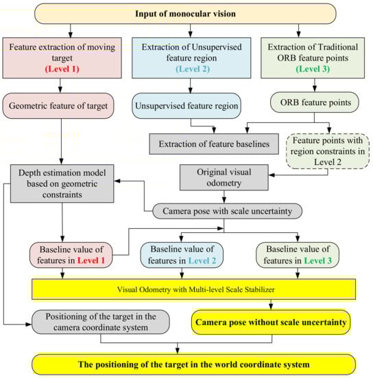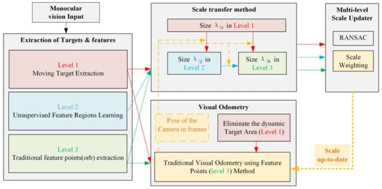 Multi-level scale stabilization algorithm: the red part corresponds to the features in Level 1; the blue part corresponds to the features in Level 2; the green part corresponds to the features in Level 3; the yellow part corresponds to the original visual odometry (VO) and the update for scale .