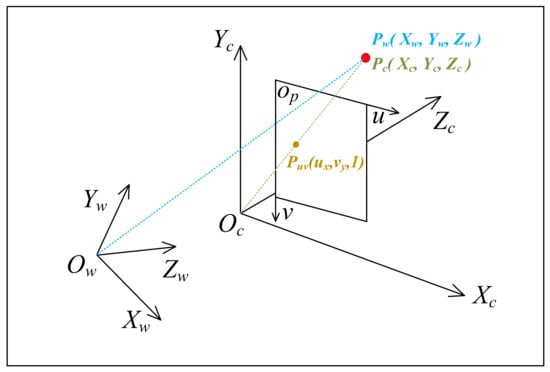 Figure 7 shows the relationship between the three coordinate systems, where blue, green, and orange represent projections under the world coordinate system, camera coordinate system, and pixel coordinate system, respectively.