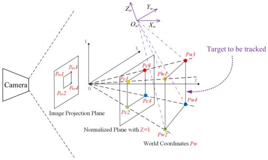 The input of the depth estimation module is a known pinhole camera model and the pixel coordinates of the feature points, and the output is the depth estimation equations with the depth information of feature points as the unknown number. In this paper, target features are firstly abstracted as geometric shapes such as parallelograms, as shown in Figure 8. The coordinates of the target in the world coordinate system are defined as . The coordinates in the camera coordinate system are defined as . The coordinates of the target in the two-dimensional image coordinate system are defined as . The normalized projection points of the normalized plane. are defined as