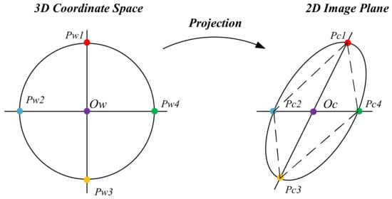 Similarly, for the circular target, considering the properties of circular projection: the projection of the circular is circular or elliptical, and the projection of the circular is still the center of the projection. Using the image algorithm, we can obtain the center of the projection surface image. According to the projection properties, the line segment obtained by the intersection of any two rays in the center and the graph is radius R, as shown in Figure 9. According to the symmetry of the circle, the shape composed of four intersections must be a parallelogram, so solving the depth problem essentially returns to the above method of solving the parallelogram.