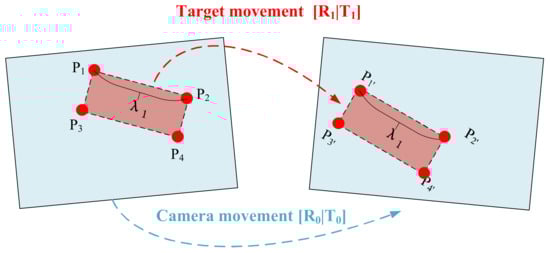 Figure 10 shows the schematic diagram of the typical double-motion problem. Here, we abstract the moving target as a rigid body like a parallelogram. The rotation of the monocular camera between the two frames has been obtained by the traditional VO method. Because of the scale uncertainty of the monocular vision, is a parameter that is proportional to the actual spatial motion. What we need to solve is . At the same time, given the baseline size of the moving rigid body target, considering the length of P1P2 in the graph is the size in Level 1, we can solve the actual by solving the motion of the rigid body.