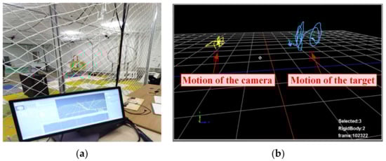 The author designed multiple sets of experiments based on indoor environment to test and verify the algorithm. In those experiments, a visual motion capture system named ZVR was employed to calibrate the true value of the target’s trajectory. The motion capture system (MCS) is composed of eight cameras, which can cover the space experiment range of 4.7 m × 3.7 m × 2.6 m, and can achieve posture tracking and data recording with the refresh rate of 260 Hz. All images in our experiments were taken by a rolling shutter monocular pinhole camera with fixed-focus.