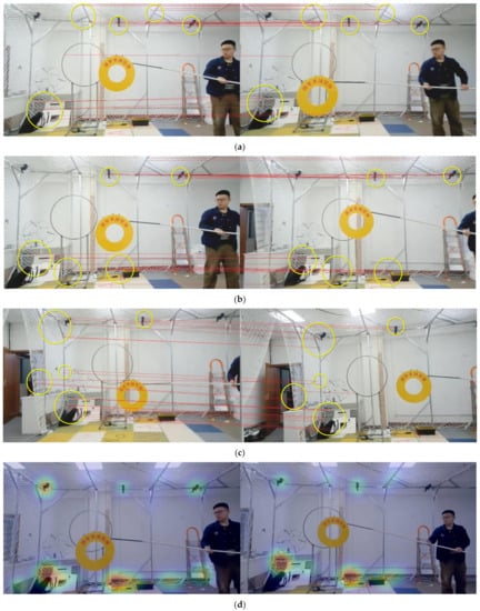 The schematic diagram of extracting orb feature point matching under the domain constraint of the Level 2 self-supervised feature area (the yellow circle area): (a–c) shows two sets of orb feature point matching under the constraints of the Siamese network feature matching area. (d) The attention heatmap of two different frames in the mobile camera.