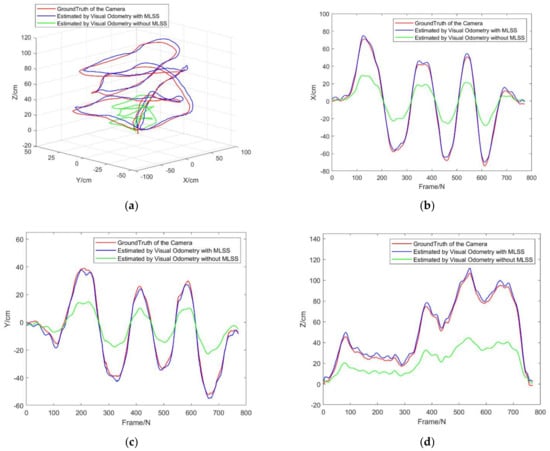 Camera localization experiment: Red represents ground truth measured by motion capture system, blue represents the camera motion trajectory estimated by MLSS−VO, and green represents the camera motion trajectory estimated by the traditional feature point method: (a) comparison of three−dimensional trajectories; (b) comparison of x-axis; (c) comparison of y-axis; (d) comparison of z-axis.