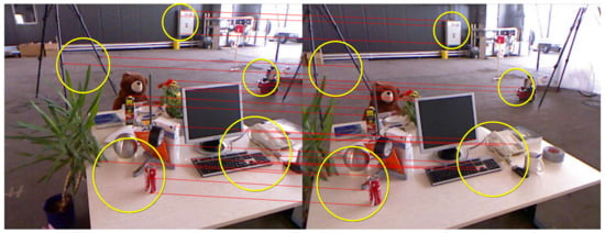 - Level 3: a large number of traditional ORB class features k. Firstly, the feature points in Level 3 are used to solve the camera motion attitude with scale uncertainty, and a small number of paired feature points are selected to obtain the baseline . Through the baselines and in Level 1 and Level 2, the baseline is obtained by combining the camera attitude.