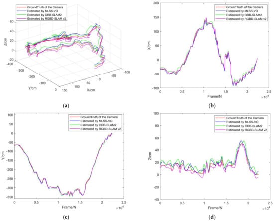 Furthermore, we compared the three algorithms of MLSS-VO, ORB-SLAM2, and RGBD-SLAM v2 using the TUM data set. It is worth noting that because ORB-SLAM2’s monocular module requires scale alignment when testing TUM data, we used the slam evaluation tool Evo to correct it. In addition, RGBD-SLAM v2 needs to use the depth map information of the data set when experimenting with the TUM data set. For the MLSS-VO experiment in this paper, we give the assumed target with calibration during initialization. The experimental results are shown in Figure 17 and Figure 18 below.