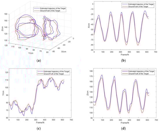 Results of the target tracking experiment: Red represents the ground truth of target measured by the motion capture system, and blue represents the target motion trajectory estimated by MLSS-VO and the target positioning algorithm based on geometric constraints: (a) comparison of three-dimensional trajectories; (b) comparison of x-axis; (c) comparison of y-axis; (d) comparison.