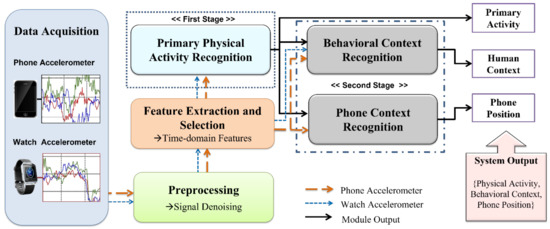 Figure 2 provides a block diagram of the proposed methodology for ARW that entails a two-stage classification model, consisting of four crucial steps as follows: (1) data acquisition and preprocessing, (2) feature extraction and feature selection, (3) primary physical activity recognition, (4) activity-aware context recognition. The subsequent sections present the necessary details for each step of the proposed ARW method.
