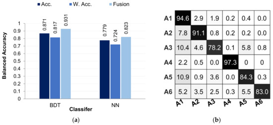 (a) Average results attained for PPAR using BDT and NN classifiers; (b) Confusion matrix (in percentage form) for the best-case PPAR performance accomplished with BDT using the phone and watch accelerometer combination. The labels A1-A6 represent six activities, i.e., lying, sitting, walking, standing, running, and bicycling, respectively.